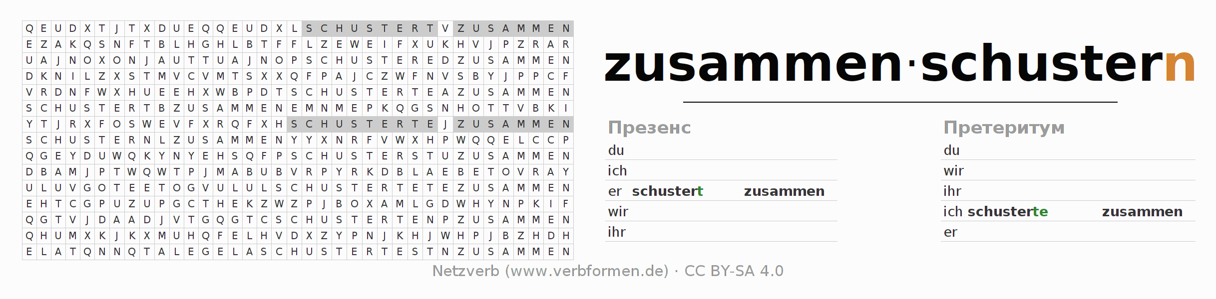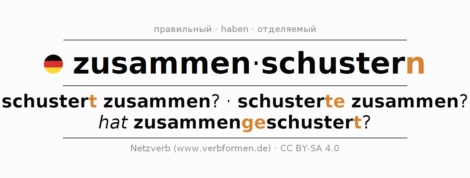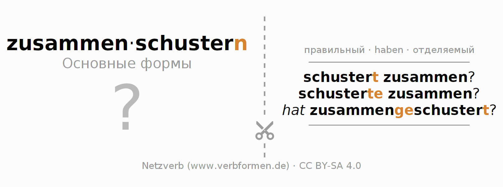 Глагольные таблицы, содержащие все формы глагола zusammenschustern, для наглядности объединены в одну общую таблицу.