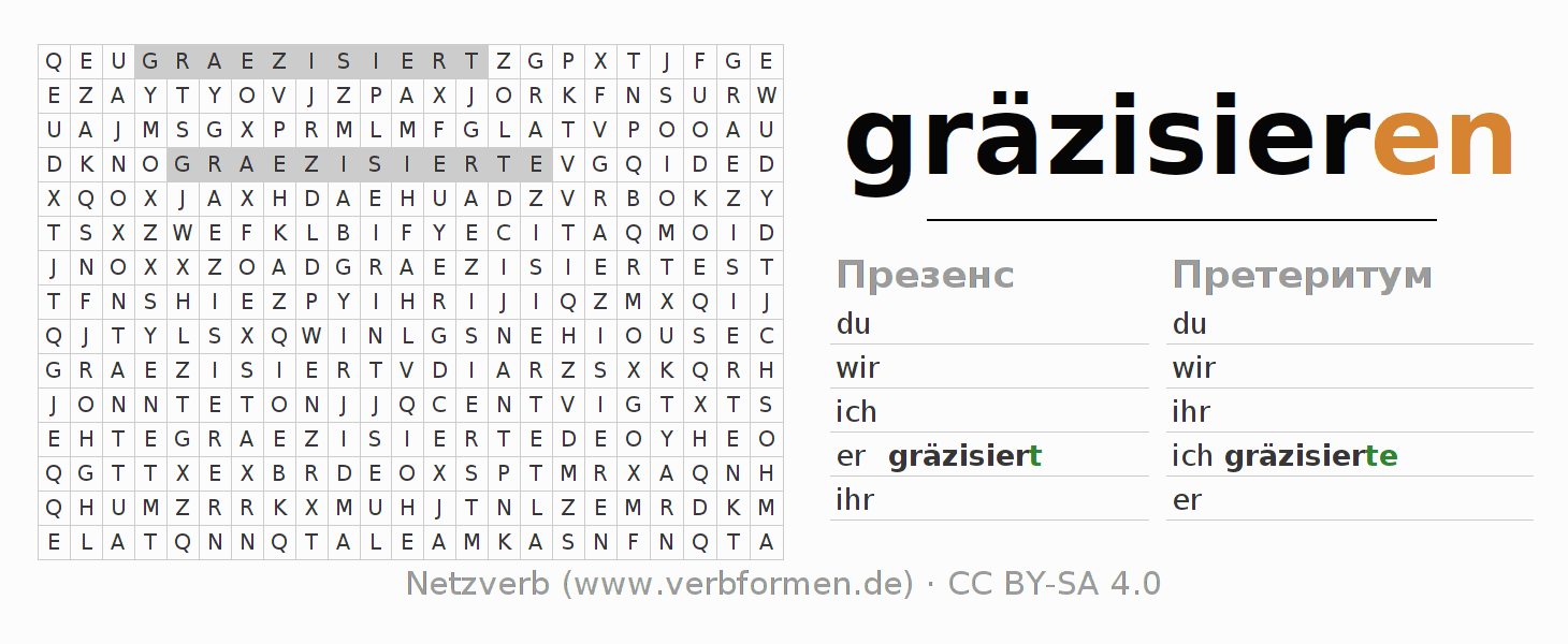 Рабочие материалы служат обучением спряжениям глагола gräzisieren на уроке и при самообучении. Рабочие материалы могут быть свободно использованы в рамках лицензии CC BY-SA 4.0 в виде Открытых образовательных ресурсов(ООР) например могут быть бесплатно использованы на уроке. Для этого имеется много различных типов рабочих материалов для глагола gräzisieren в наличии. Это таблицы спряжений, головоломки и игры. Весь учебный материал доступен бесплатно как файлы PDF, в виде изображений или как интерактивная версия браузера. В дополнение к задачам, имеются бесчисленные примеры для gräzisieren а также помощь в использовании глаголов.