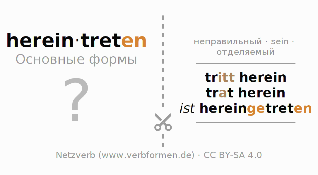 С помощью обучающих карточек можно эффективно и удобно изучать и запоминать глагольные формы hereintreten. Обучающие карточки можно распечатать в формате PDF и вырезать.