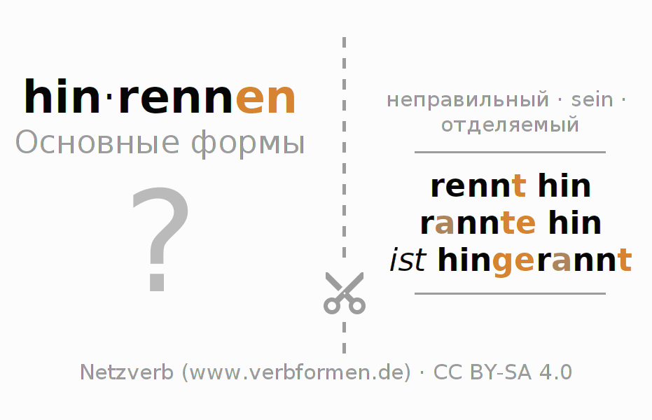 Глагольные таблицы, содержащие все формы глагола hinrennen, для наглядности объединены в одну общую таблицу.