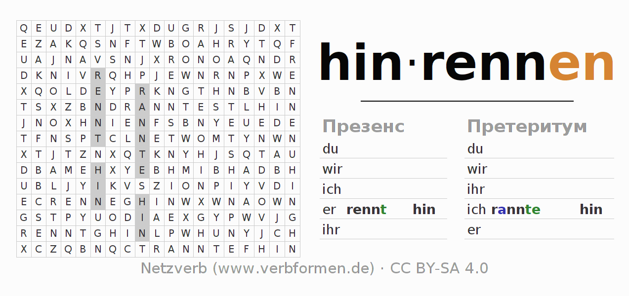 Рабочие материалы служат обучением спряжениям глагола hinrennen на уроке и при самообучении. Рабочие материалы могут быть свободно использованы в рамках лицензии CC BY-SA 4.0 в виде Открытых образовательных ресурсов(ООР) например могут быть бесплатно использованы на уроке. Для этого имеется много различных типов рабочих материалов для глагола hinrennen в наличии. Это таблицы спряжений, головоломки и игры. Весь учебный материал доступен бесплатно как файлы PDF, в виде изображений или как интерактивная версия браузера. В дополнение к задачам, имеются бесчисленные примеры для hinrennen а также помощь в использовании глаголов.