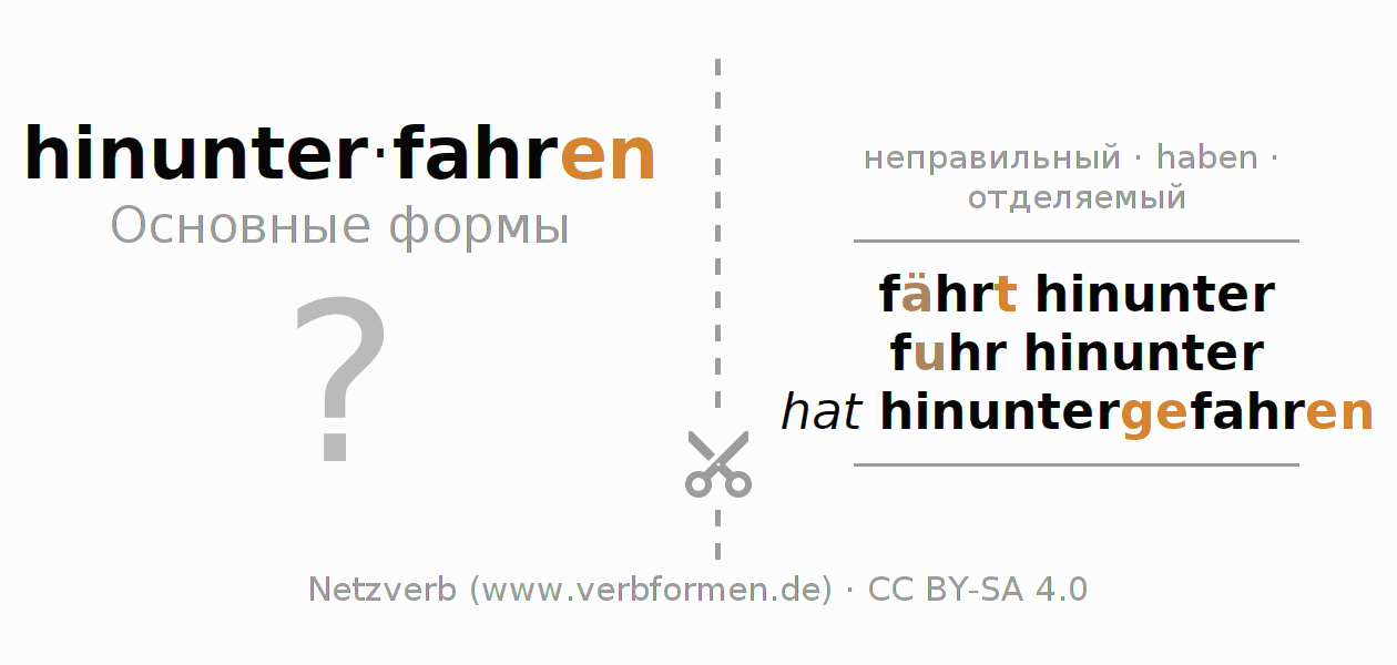 С помощью обучающих карточек можно эффективно и удобно изучать и запоминать глагольные формы hinunterfahren. Обучающие карточки можно распечатать в формате PDF и вырезать.