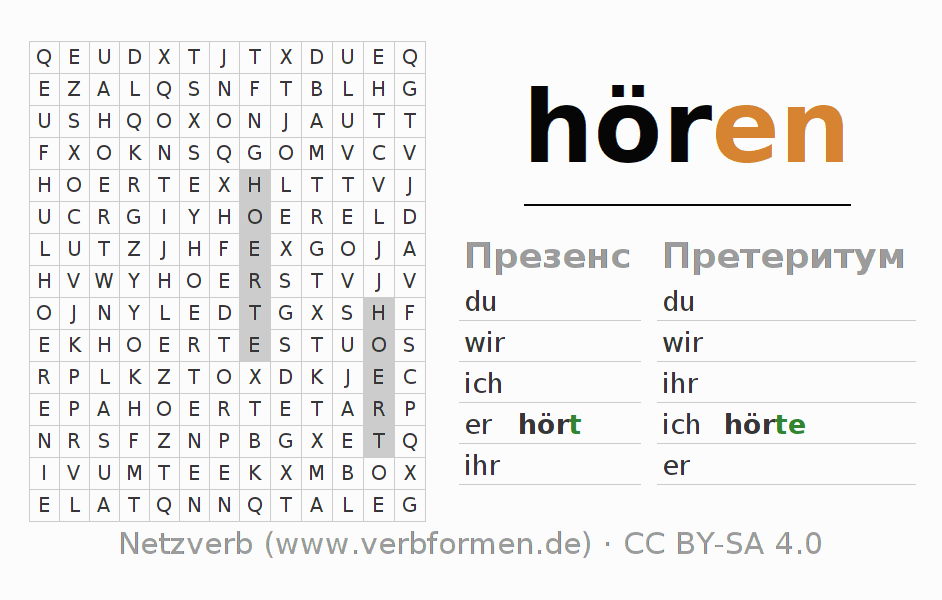 С помощью этих головоломок по поиску слов Вы можете подходящим для Вас способом изучать спряжение немецкого глагола hören.