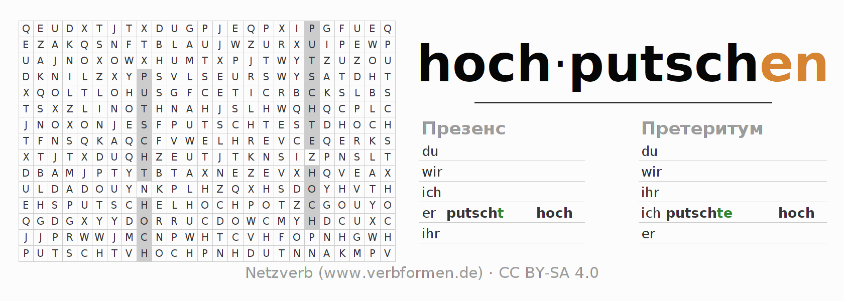 С помощью этих головоломок по поиску слов Вы можете подходящим для Вас способом изучать спряжение немецкого глагола hochputschen.