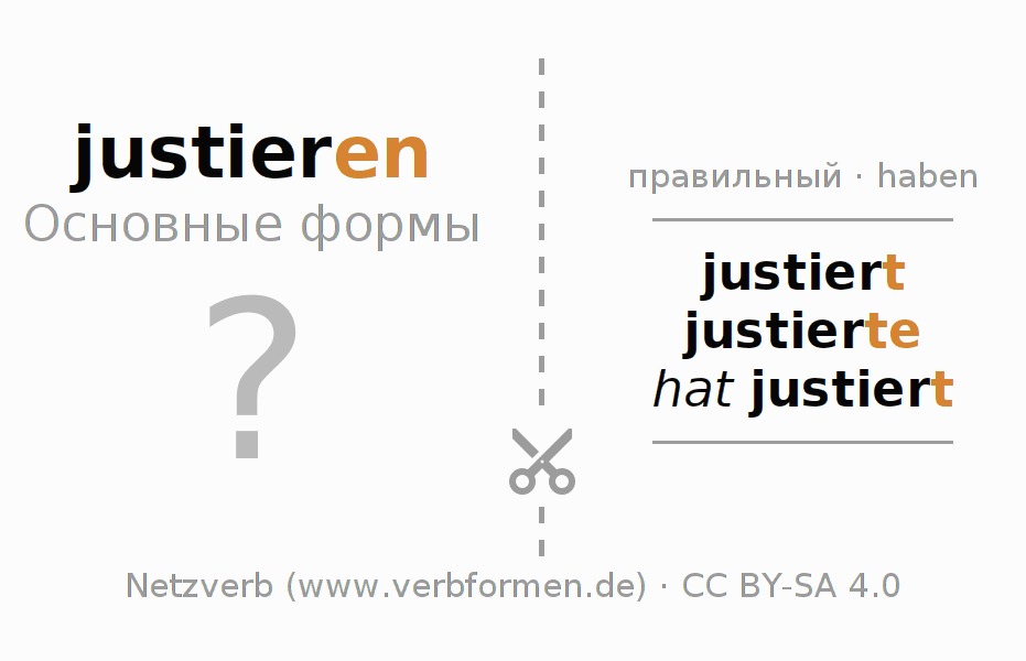 Глагольные таблицы, содержащие все формы глагола justieren, для наглядности объединены в одну общую таблицу.