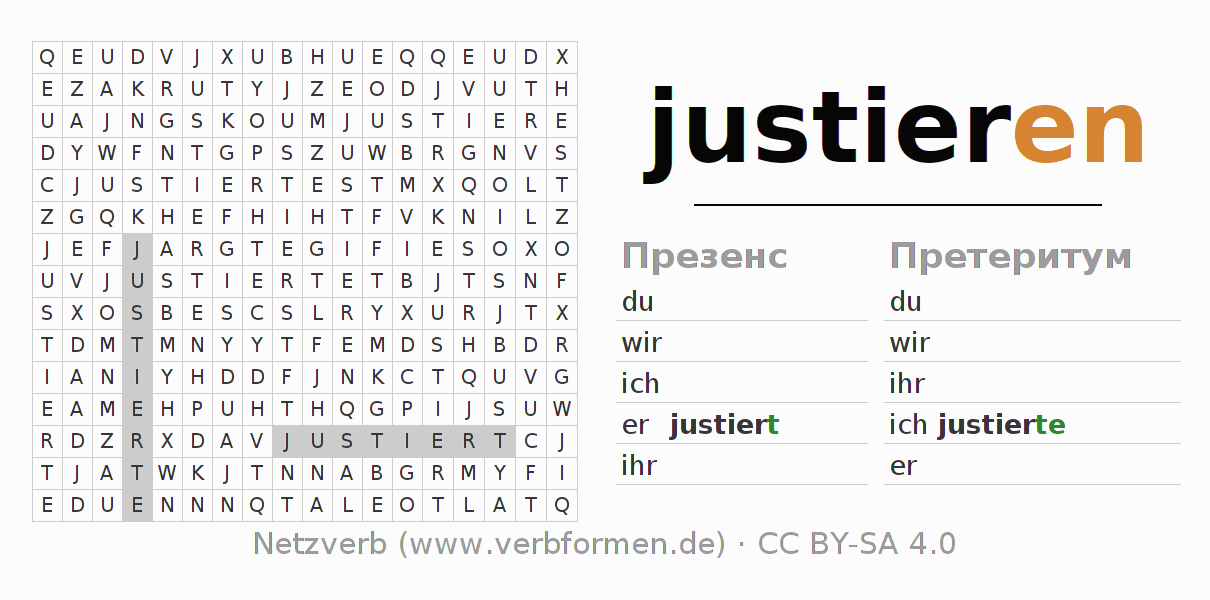 С помощью этих головоломок по поиску слов Вы можете подходящим для Вас способом изучать спряжение немецкого глагола justieren.