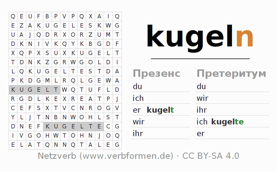 С помощью этих головоломок по поиску слов Вы можете подходящим для Вас способом изучать спряжение немецкого глагола kugeln.