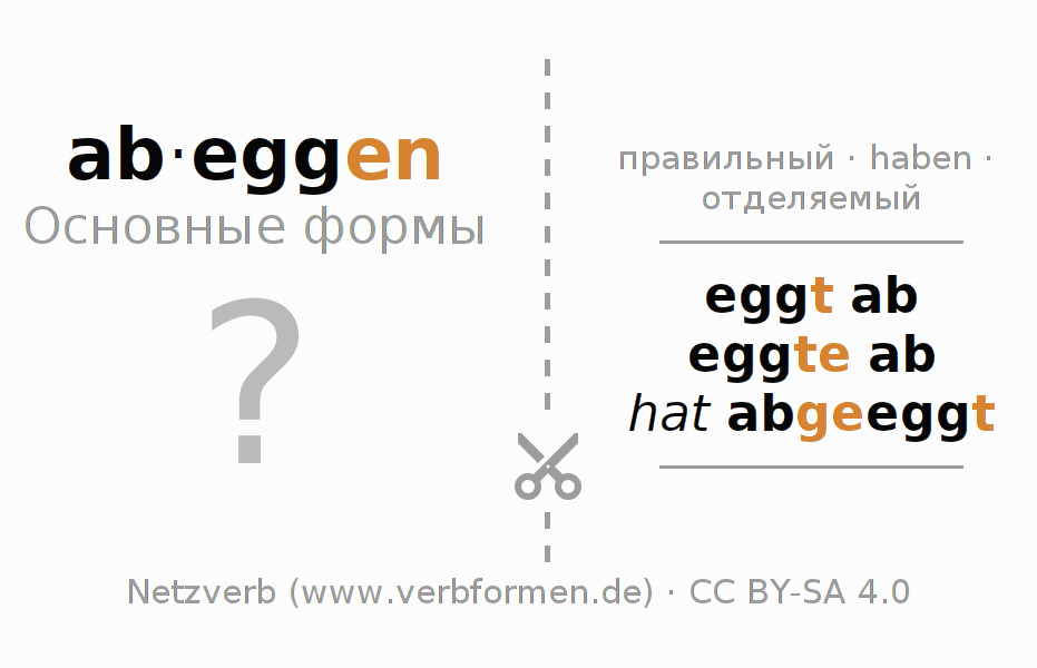 С обучающими карточками можно по отдельности изучать и тренировать спряжения немецких глаголов. Для этого на учебных листах, формы глагола abeggen стоит обрабатывать по порядку. Необходимые формы глагола должны быть представлены в голове. Затем они сверяются с подсказками на карточках. При правильном ответе подтверждается ваш прогресс в обучении. Если есть ошибки, можно использовать подсказки для запоминания неизвестных форм. Но лучше всего распечатать PDF фаил с обучающими карточками и сложить их как было указано. Таким образом их можно использовать в стопке с другими глаголами для обучения. Еще есть множество других рабочих листов с глаголами abeggen. Все материалы доступны в виде Открытых образовательных ресурсов(ООР) в рамках лицензии CC BY-SA 4.0 бесплатны и могут быть свободно использованы.