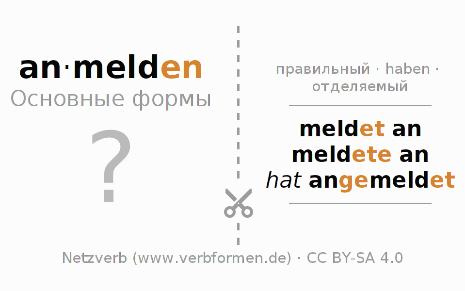 С обучающими карточками можно по отдельности изучать и тренировать спряжения немецких глаголов. Для этого на учебных листах, формы глагола anmelden стоит обрабатывать по порядку. Необходимые формы глагола должны быть представлены в голове. Затем они сверяются с подсказками на карточках. При правильном ответе подтверждается ваш прогресс в обучении. Если есть ошибки, можно использовать подсказки для запоминания неизвестных форм. Но лучше всего распечатать PDF фаил с обучающими карточками и сложить их как было указано. Таким образом их можно использовать в стопке с другими глаголами для обучения. Еще есть множество других рабочих листов с глаголами anmelden. Все материалы доступны в виде Открытых образовательных ресурсов(ООР) в рамках лицензии CC BY-SA 4.0 бесплатны и могут быть свободно использованы.