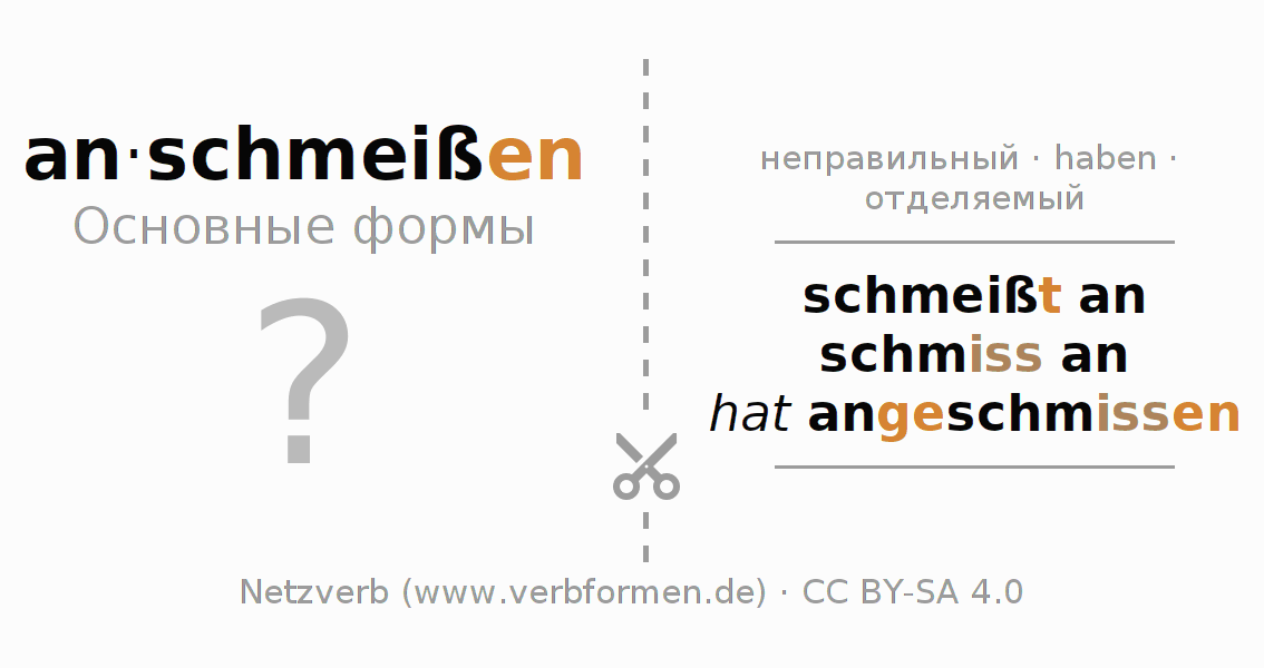 С обучающими карточками можно по отдельности изучать и тренировать спряжения немецких глаголов. Для этого на учебных листах, формы глагола anschmeißen стоит обрабатывать по порядку. Необходимые формы глагола должны быть представлены в голове. Затем они сверяются с подсказками на карточках. При правильном ответе подтверждается ваш прогресс в обучении. Если есть ошибки, можно использовать подсказки для запоминания неизвестных форм. Но лучше всего распечатать PDF фаил с обучающими карточками и сложить их как было указано. Таким образом их можно использовать в стопке с другими глаголами для обучения. Еще есть множество других рабочих листов с глаголами anschmeißen. Все материалы доступны в виде Открытых образовательных ресурсов(ООР) в рамках лицензии CC BY-SA 4.0 бесплатны и могут быть свободно использованы.