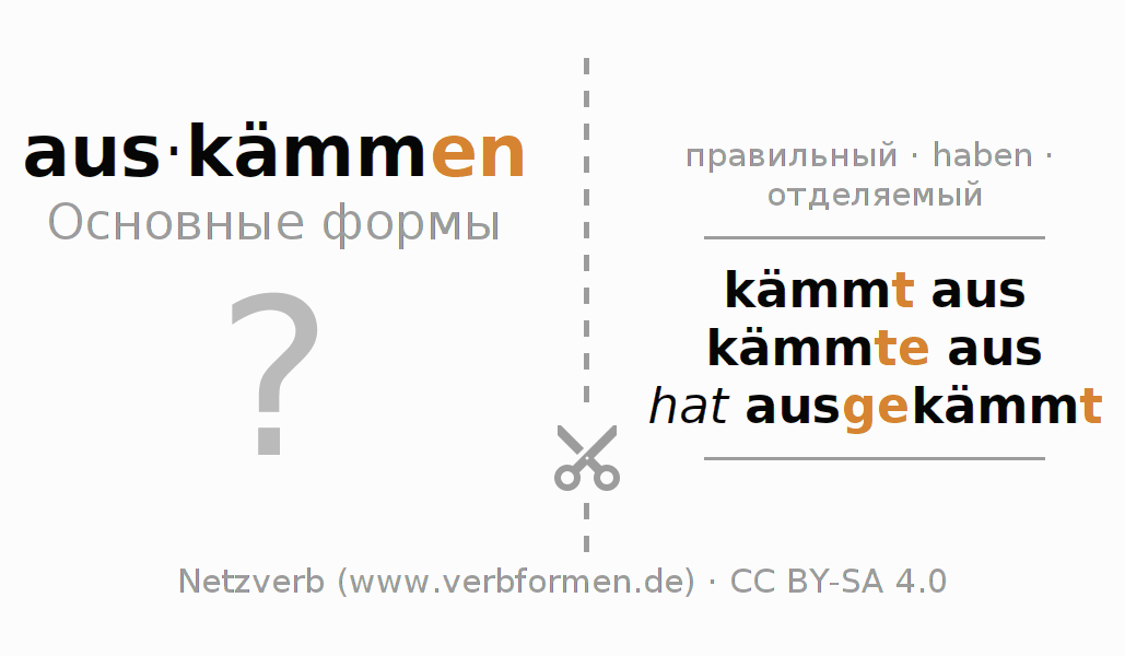С обучающими карточками можно по отдельности изучать и тренировать спряжения немецких глаголов. Для этого на учебных листах, формы глагола auskämmen стоит обрабатывать по порядку. Необходимые формы глагола должны быть представлены в голове. Затем они сверяются с подсказками на карточках. При правильном ответе подтверждается ваш прогресс в обучении. Если есть ошибки, можно использовать подсказки для запоминания неизвестных форм. Но лучше всего распечатать PDF фаил с обучающими карточками и сложить их как было указано. Таким образом их можно использовать в стопке с другими глаголами для обучения. Еще есть множество других рабочих листов с глаголами auskämmen. Все материалы доступны в виде Открытых образовательных ресурсов(ООР) в рамках лицензии CC BY-SA 4.0 бесплатны и могут быть свободно использованы.