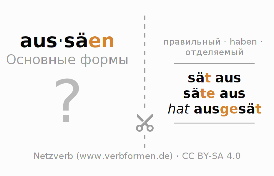 С обучающими карточками можно по отдельности изучать и тренировать спряжения немецких глаголов. Для этого на учебных листах, формы глагола aussäen стоит обрабатывать по порядку. Необходимые формы глагола должны быть представлены в голове. Затем они сверяются с подсказками на карточках. При правильном ответе подтверждается ваш прогресс в обучении. Если есть ошибки, можно использовать подсказки для запоминания неизвестных форм. Но лучше всего распечатать PDF фаил с обучающими карточками и сложить их как было указано. Таким образом их можно использовать в стопке с другими глаголами для обучения. Еще есть множество других рабочих листов с глаголами aussäen. Все материалы доступны в виде Открытых образовательных ресурсов(ООР) в рамках лицензии CC BY-SA 4.0 бесплатны и могут быть свободно использованы.