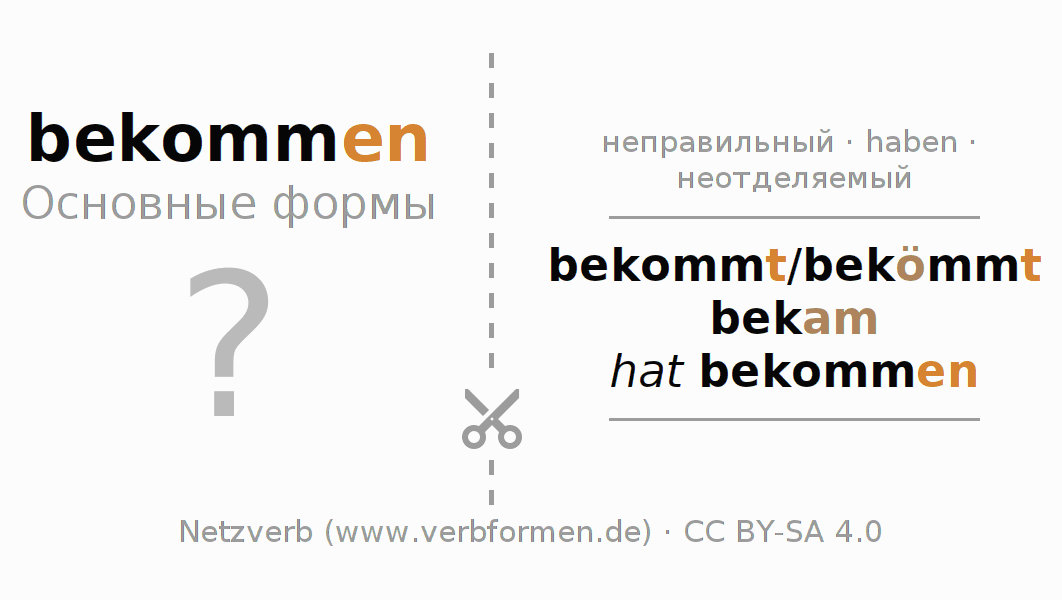 С обучающими карточками можно по отдельности изучать и тренировать спряжения немецких глаголов. Для этого на учебных листах, формы глагола bekommen стоит обрабатывать по порядку. Необходимые формы глагола должны быть представлены в голове. Затем они сверяются с подсказками на карточках. При правильном ответе подтверждается ваш прогресс в обучении. Если есть ошибки, можно использовать подсказки для запоминания неизвестных форм. Но лучше всего распечатать PDF фаил с обучающими карточками и сложить их как было указано. Таким образом их можно использовать в стопке с другими глаголами для обучения. Еще есть множество других рабочих листов с глаголами bekommen. Все материалы доступны в виде Открытых образовательных ресурсов(ООР) в рамках лицензии CC BY-SA 4.0 бесплатны и могут быть свободно использованы.
