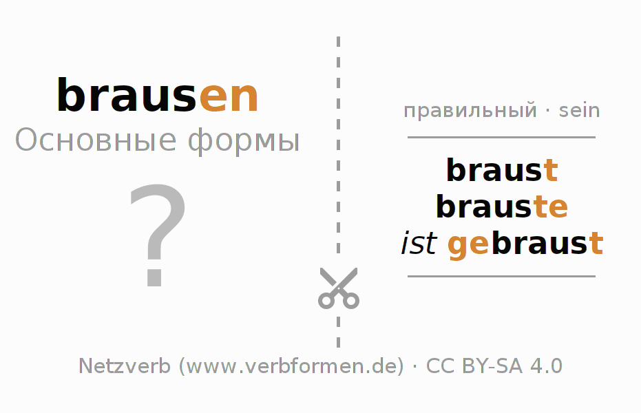 С обучающими карточками можно по отдельности изучать и тренировать спряжения немецких глаголов. Для этого на учебных листах, формы глагола brausen стоит обрабатывать по порядку. Необходимые формы глагола должны быть представлены в голове. Затем они сверяются с подсказками на карточках. При правильном ответе подтверждается ваш прогресс в обучении. Если есть ошибки, можно использовать подсказки для запоминания неизвестных форм. Но лучше всего распечатать PDF фаил с обучающими карточками и сложить их как было указано. Таким образом их можно использовать в стопке с другими глаголами для обучения. Еще есть множество других рабочих листов с глаголами brausen. Все материалы доступны в виде Открытых образовательных ресурсов(ООР) в рамках лицензии CC BY-SA 4.0 бесплатны и могут быть свободно использованы.