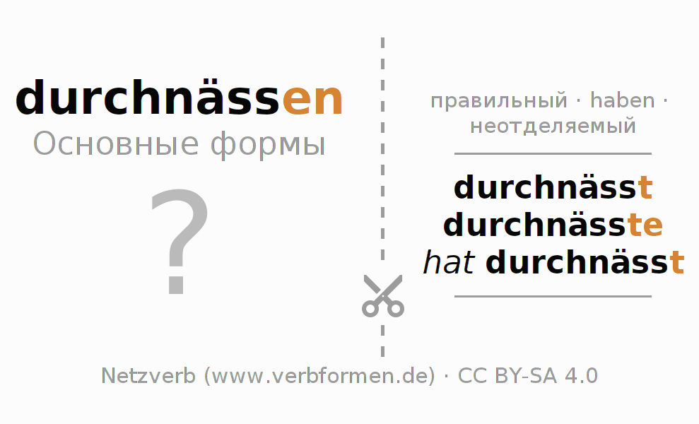 С обучающими карточками можно по отдельности изучать и тренировать спряжения немецких глаголов. Для этого на учебных листах, формы глагола durchnässen стоит обрабатывать по порядку. Необходимые формы глагола должны быть представлены в голове. Затем они сверяются с подсказками на карточках. При правильном ответе подтверждается ваш прогресс в обучении. Если есть ошибки, можно использовать подсказки для запоминания неизвестных форм. Но лучше всего распечатать PDF фаил с обучающими карточками и сложить их как было указано. Таким образом их можно использовать в стопке с другими глаголами для обучения. Еще есть множество других рабочих листов с глаголами durchnässen. Все материалы доступны в виде Открытых образовательных ресурсов(ООР) в рамках лицензии CC BY-SA 4.0 бесплатны и могут быть свободно использованы.