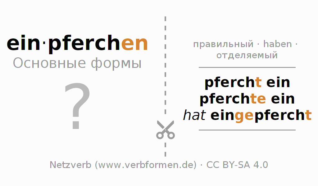 С обучающими карточками можно по отдельности изучать и тренировать спряжения немецких глаголов. Для этого на учебных листах, формы глагола einpferchen стоит обрабатывать по порядку. Необходимые формы глагола должны быть представлены в голове. Затем они сверяются с подсказками на карточках. При правильном ответе подтверждается ваш прогресс в обучении. Если есть ошибки, можно использовать подсказки для запоминания неизвестных форм. Но лучше всего распечатать PDF фаил с обучающими карточками и сложить их как было указано. Таким образом их можно использовать в стопке с другими глаголами для обучения. Еще есть множество других рабочих листов с глаголами einpferchen. Все материалы доступны в виде Открытых образовательных ресурсов(ООР) в рамках лицензии CC BY-SA 4.0 бесплатны и могут быть свободно использованы.