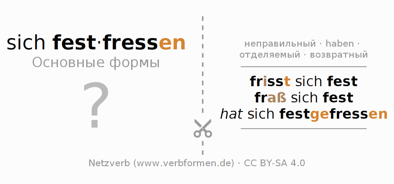 С обучающими карточками можно по отдельности изучать и тренировать спряжения немецких глаголов. Для этого на учебных листах, формы глагола festfressen стоит обрабатывать по порядку. Необходимые формы глагола должны быть представлены в голове. Затем они сверяются с подсказками на карточках. При правильном ответе подтверждается ваш прогресс в обучении. Если есть ошибки, можно использовать подсказки для запоминания неизвестных форм. Но лучше всего распечатать PDF фаил с обучающими карточками и сложить их как было указано. Таким образом их можно использовать в стопке с другими глаголами для обучения. Еще есть множество других рабочих листов с глаголами festfressen. Все материалы доступны в виде Открытых образовательных ресурсов(ООР) в рамках лицензии CC BY-SA 4.0 бесплатны и могут быть свободно использованы.
