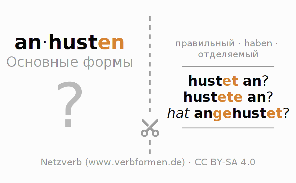 С обучающими карточками можно по отдельности изучать и тренировать спряжения немецких глаголов. Для этого на учебных листах, формы глагола anhusten стоит обрабатывать по порядку. Необходимые формы глагола должны быть представлены в голове. Затем они сверяются с подсказками на карточках. При правильном ответе подтверждается ваш прогресс в обучении. Если есть ошибки, можно использовать подсказки для запоминания неизвестных форм. Но лучше всего распечатать PDF фаил с обучающими карточками и сложить их как было указано. Таким образом их можно использовать в стопке с другими глаголами для обучения. Еще есть множество других рабочих листов с глаголами anhusten. Все материалы доступны в виде Открытых образовательных ресурсов(ООР) в рамках лицензии CC BY-SA 4.0 бесплатны и могут быть свободно использованы.