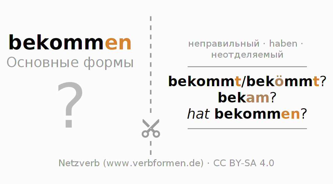 С обучающими карточками можно по отдельности изучать и тренировать спряжения немецких глаголов. Для этого на учебных листах, формы глагола bekommen стоит обрабатывать по порядку. Необходимые формы глагола должны быть представлены в голове. Затем они сверяются с подсказками на карточках. При правильном ответе подтверждается ваш прогресс в обучении. Если есть ошибки, можно использовать подсказки для запоминания неизвестных форм. Но лучше всего распечатать PDF фаил с обучающими карточками и сложить их как было указано. Таким образом их можно использовать в стопке с другими глаголами для обучения. Еще есть множество других рабочих листов с глаголами bekommen. Все материалы доступны в виде Открытых образовательных ресурсов(ООР) в рамках лицензии CC BY-SA 4.0 бесплатны и могут быть свободно использованы.