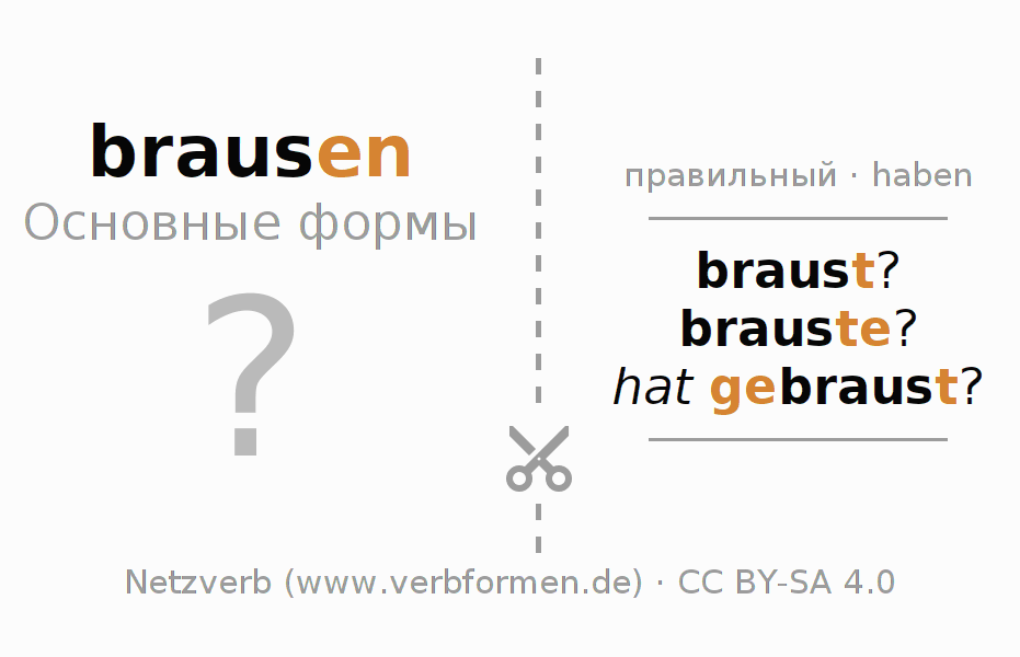 С обучающими карточками можно по отдельности изучать и тренировать спряжения немецких глаголов. Для этого на учебных листах, формы глагола brausen стоит обрабатывать по порядку. Необходимые формы глагола должны быть представлены в голове. Затем они сверяются с подсказками на карточках. При правильном ответе подтверждается ваш прогресс в обучении. Если есть ошибки, можно использовать подсказки для запоминания неизвестных форм. Но лучше всего распечатать PDF фаил с обучающими карточками и сложить их как было указано. Таким образом их можно использовать в стопке с другими глаголами для обучения. Еще есть множество других рабочих листов с глаголами brausen. Все материалы доступны в виде Открытых образовательных ресурсов(ООР) в рамках лицензии CC BY-SA 4.0 бесплатны и могут быть свободно использованы.