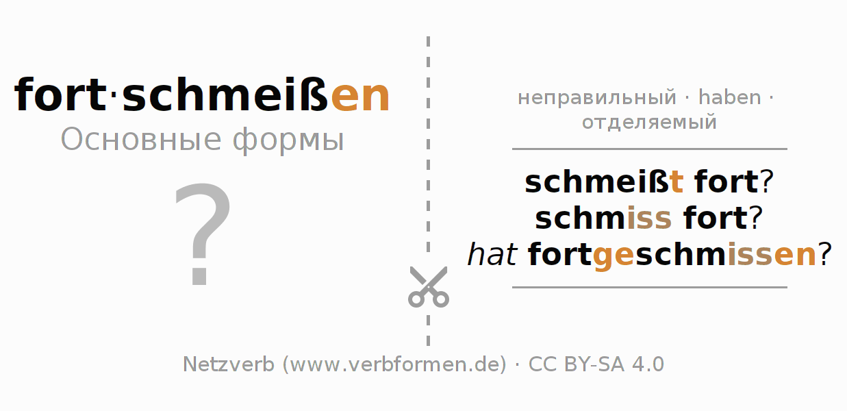 С обучающими карточками можно по отдельности изучать и тренировать спряжения немецких глаголов. Для этого на учебных листах, формы глагола fortschmeißen стоит обрабатывать по порядку. Необходимые формы глагола должны быть представлены в голове. Затем они сверяются с подсказками на карточках. При правильном ответе подтверждается ваш прогресс в обучении. Если есть ошибки, можно использовать подсказки для запоминания неизвестных форм. Но лучше всего распечатать PDF фаил с обучающими карточками и сложить их как было указано. Таким образом их можно использовать в стопке с другими глаголами для обучения. Еще есть множество других рабочих листов с глаголами fortschmeißen. Все материалы доступны в виде Открытых образовательных ресурсов(ООР) в рамках лицензии CC BY-SA 4.0 бесплатны и могут быть свободно использованы.