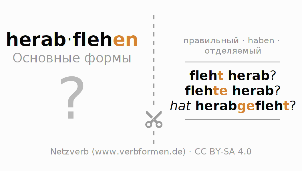 С обучающими карточками можно по отдельности изучать и тренировать спряжения немецких глаголов. Для этого на учебных листах, формы глагола herabflehen стоит обрабатывать по порядку. Необходимые формы глагола должны быть представлены в голове. Затем они сверяются с подсказками на карточках. При правильном ответе подтверждается ваш прогресс в обучении. Если есть ошибки, можно использовать подсказки для запоминания неизвестных форм. Но лучше всего распечатать PDF фаил с обучающими карточками и сложить их как было указано. Таким образом их можно использовать в стопке с другими глаголами для обучения. Еще есть множество других рабочих листов с глаголами herabflehen. Все материалы доступны в виде Открытых образовательных ресурсов(ООР) в рамках лицензии CC BY-SA 4.0 бесплатны и могут быть свободно использованы.