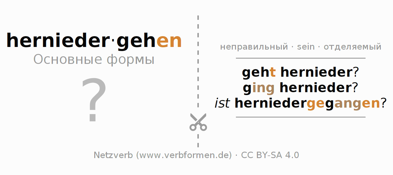 С обучающими карточками можно по отдельности изучать и тренировать спряжения немецких глаголов. Для этого на учебных листах, формы глагола herniedergehen стоит обрабатывать по порядку. Необходимые формы глагола должны быть представлены в голове. Затем они сверяются с подсказками на карточках. При правильном ответе подтверждается ваш прогресс в обучении. Если есть ошибки, можно использовать подсказки для запоминания неизвестных форм. Но лучше всего распечатать PDF фаил с обучающими карточками и сложить их как было указано. Таким образом их можно использовать в стопке с другими глаголами для обучения. Еще есть множество других рабочих листов с глаголами herniedergehen. Все материалы доступны в виде Открытых образовательных ресурсов(ООР) в рамках лицензии CC BY-SA 4.0 бесплатны и могут быть свободно использованы.