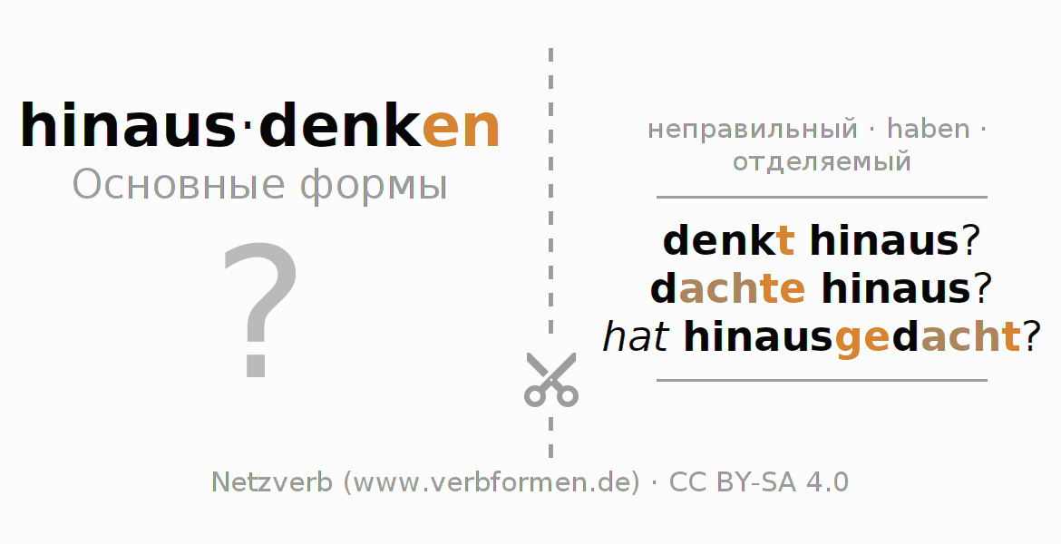 С обучающими карточками можно по отдельности изучать и тренировать спряжения немецких глаголов. Для этого на учебных листах, формы глагола hinausdenken стоит обрабатывать по порядку. Необходимые формы глагола должны быть представлены в голове. Затем они сверяются с подсказками на карточках. При правильном ответе подтверждается ваш прогресс в обучении. Если есть ошибки, можно использовать подсказки для запоминания неизвестных форм. Но лучше всего распечатать PDF фаил с обучающими карточками и сложить их как было указано. Таким образом их можно использовать в стопке с другими глаголами для обучения. Еще есть множество других рабочих листов с глаголами hinausdenken. Все материалы доступны в виде Открытых образовательных ресурсов(ООР) в рамках лицензии CC BY-SA 4.0 бесплатны и могут быть свободно использованы.