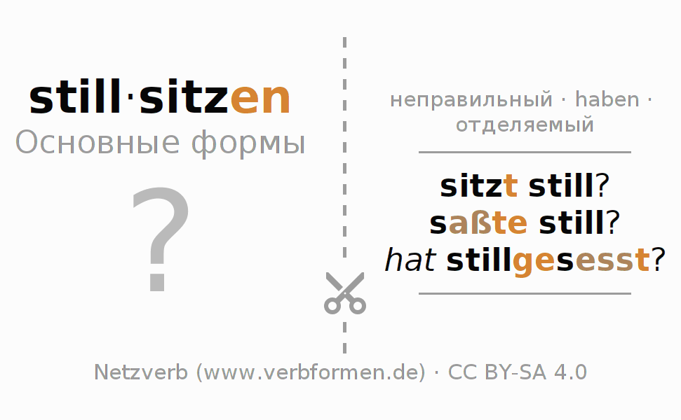 С обучающими карточками можно по отдельности изучать и тренировать спряжения немецких глаголов. Для этого на учебных листах, формы глагола stillsitzen стоит обрабатывать по порядку. Необходимые формы глагола должны быть представлены в голове. Затем они сверяются с подсказками на карточках. При правильном ответе подтверждается ваш прогресс в обучении. Если есть ошибки, можно использовать подсказки для запоминания неизвестных форм. Но лучше всего распечатать PDF фаил с обучающими карточками и сложить их как было указано. Таким образом их можно использовать в стопке с другими глаголами для обучения. Еще есть множество других рабочих листов с глаголами stillsitzen. Все материалы доступны в виде Открытых образовательных ресурсов(ООР) в рамках лицензии CC BY-SA 4.0 бесплатны и могут быть свободно использованы.