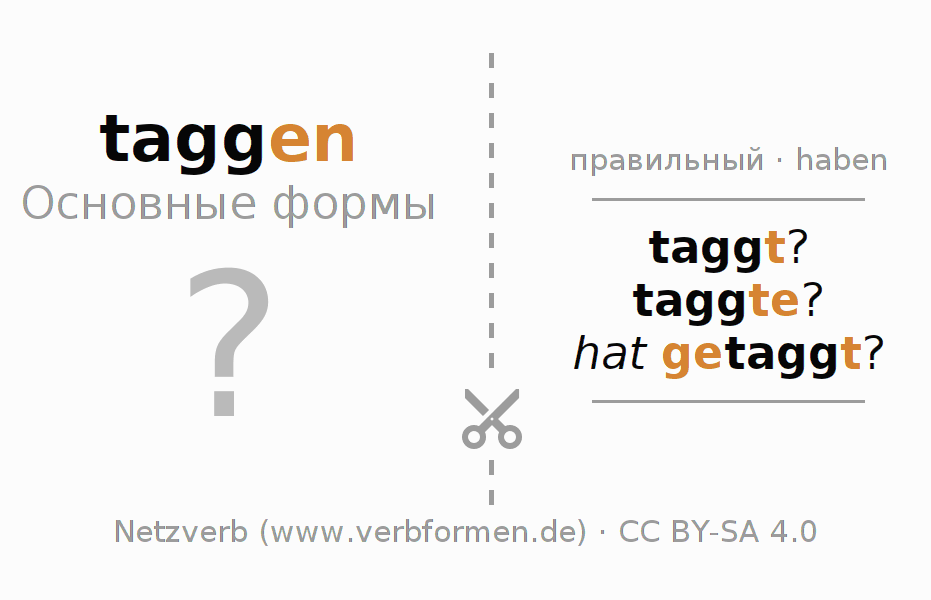 С обучающими карточками можно по отдельности изучать и тренировать спряжения немецких глаголов. Для этого на учебных листах, формы глагола taggen стоит обрабатывать по порядку. Необходимые формы глагола должны быть представлены в голове. Затем они сверяются с подсказками на карточках. При правильном ответе подтверждается ваш прогресс в обучении. Если есть ошибки, можно использовать подсказки для запоминания неизвестных форм. Но лучше всего распечатать PDF фаил с обучающими карточками и сложить их как было указано. Таким образом их можно использовать в стопке с другими глаголами для обучения. Еще есть множество других рабочих листов с глаголами taggen. Все материалы доступны в виде Открытых образовательных ресурсов(ООР) в рамках лицензии CC BY-SA 4.0 бесплатны и могут быть свободно использованы.