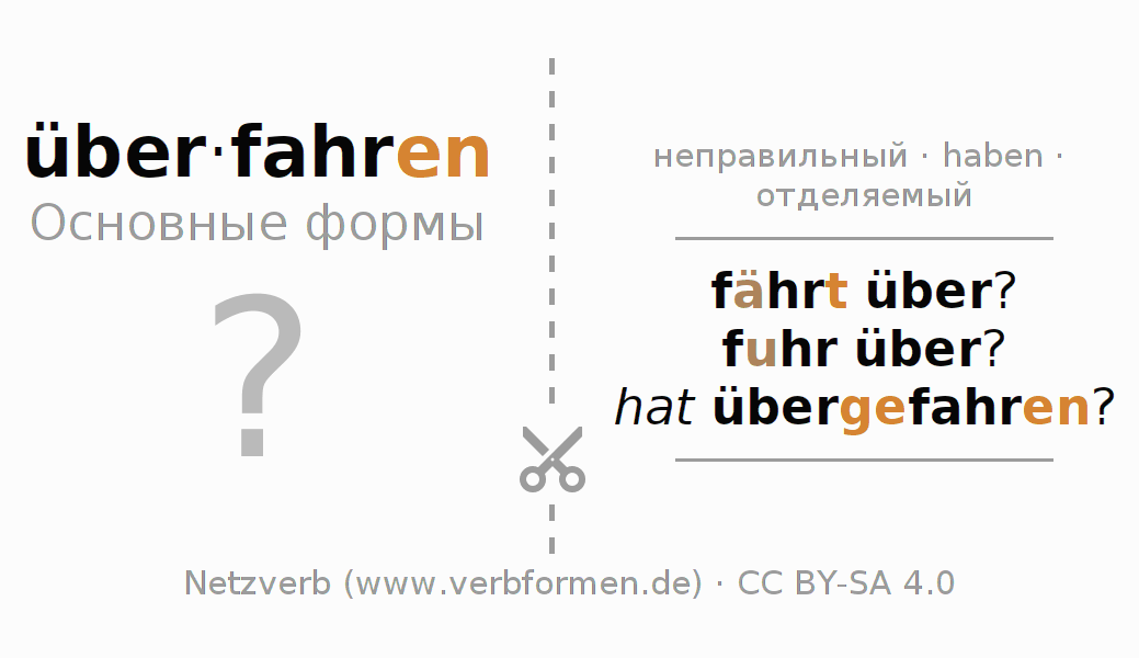 С обучающими карточками можно по отдельности изучать и тренировать спряжения немецких глаголов. Для этого на учебных листах, формы глагола überfahren стоит обрабатывать по порядку. Необходимые формы глагола должны быть представлены в голове. Затем они сверяются с подсказками на карточках. При правильном ответе подтверждается ваш прогресс в обучении. Если есть ошибки, можно использовать подсказки для запоминания неизвестных форм. Но лучше всего распечатать PDF фаил с обучающими карточками и сложить их как было указано. Таким образом их можно использовать в стопке с другими глаголами для обучения. Еще есть множество других рабочих листов с глаголами überfahren. Все материалы доступны в виде Открытых образовательных ресурсов(ООР) в рамках лицензии CC BY-SA 4.0 бесплатны и могут быть свободно использованы.