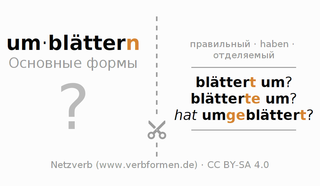 С обучающими карточками можно по отдельности изучать и тренировать спряжения немецких глаголов. Для этого на учебных листах, формы глагола umblättern стоит обрабатывать по порядку. Необходимые формы глагола должны быть представлены в голове. Затем они сверяются с подсказками на карточках. При правильном ответе подтверждается ваш прогресс в обучении. Если есть ошибки, можно использовать подсказки для запоминания неизвестных форм. Но лучше всего распечатать PDF фаил с обучающими карточками и сложить их как было указано. Таким образом их можно использовать в стопке с другими глаголами для обучения. Еще есть множество других рабочих листов с глаголами umblättern. Все материалы доступны в виде Открытых образовательных ресурсов(ООР) в рамках лицензии CC BY-SA 4.0 бесплатны и могут быть свободно использованы.