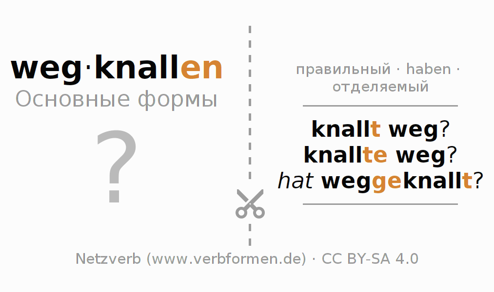 С обучающими карточками можно по отдельности изучать и тренировать спряжения немецких глаголов. Для этого на учебных листах, формы глагола wegknallen стоит обрабатывать по порядку. Необходимые формы глагола должны быть представлены в голове. Затем они сверяются с подсказками на карточках. При правильном ответе подтверждается ваш прогресс в обучении. Если есть ошибки, можно использовать подсказки для запоминания неизвестных форм. Но лучше всего распечатать PDF фаил с обучающими карточками и сложить их как было указано. Таким образом их можно использовать в стопке с другими глаголами для обучения. Еще есть множество других рабочих листов с глаголами wegknallen. Все материалы доступны в виде Открытых образовательных ресурсов(ООР) в рамках лицензии CC BY-SA 4.0 бесплатны и могут быть свободно использованы.