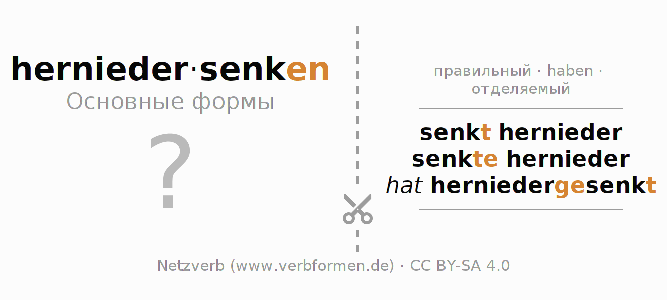 С обучающими карточками можно по отдельности изучать и тренировать спряжения немецких глаголов. Для этого на учебных листах, формы глагола herniedersenken стоит обрабатывать по порядку. Необходимые формы глагола должны быть представлены в голове. Затем они сверяются с подсказками на карточках. При правильном ответе подтверждается ваш прогресс в обучении. Если есть ошибки, можно использовать подсказки для запоминания неизвестных форм. Но лучше всего распечатать PDF фаил с обучающими карточками и сложить их как было указано. Таким образом их можно использовать в стопке с другими глаголами для обучения. Еще есть множество других рабочих листов с глаголами herniedersenken. Все материалы доступны в виде Открытых образовательных ресурсов(ООР) в рамках лицензии CC BY-SA 4.0 бесплатны и могут быть свободно использованы.