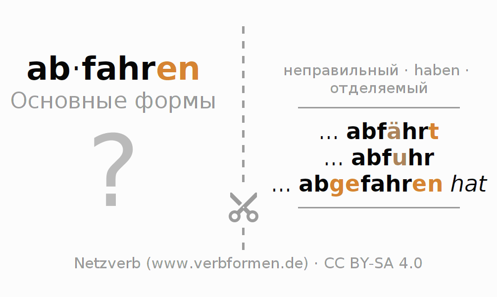 С обучающими карточками можно по отдельности изучать и тренировать спряжения немецких глаголов. Для этого на учебных листах, формы глагола abfahren стоит обрабатывать по порядку. Необходимые формы глагола должны быть представлены в голове. Затем они сверяются с подсказками на карточках. При правильном ответе подтверждается ваш прогресс в обучении. Если есть ошибки, можно использовать подсказки для запоминания неизвестных форм. Но лучше всего распечатать PDF фаил с обучающими карточками и сложить их как было указано. Таким образом их можно использовать в стопке с другими глаголами для обучения. Еще есть множество других рабочих листов с глаголами abfahren. Все материалы доступны в виде Открытых образовательных ресурсов(ООР) в рамках лицензии CC BY-SA 4.0 бесплатны и могут быть свободно использованы.