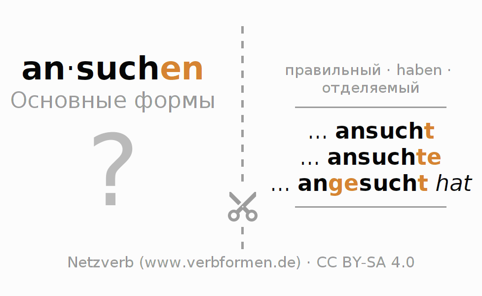 С обучающими карточками можно по отдельности изучать и тренировать спряжения немецких глаголов. Для этого на учебных листах, формы глагола ansuchen стоит обрабатывать по порядку. Необходимые формы глагола должны быть представлены в голове. Затем они сверяются с подсказками на карточках. При правильном ответе подтверждается ваш прогресс в обучении. Если есть ошибки, можно использовать подсказки для запоминания неизвестных форм. Но лучше всего распечатать PDF фаил с обучающими карточками и сложить их как было указано. Таким образом их можно использовать в стопке с другими глаголами для обучения. Еще есть множество других рабочих листов с глаголами ansuchen. Все материалы доступны в виде Открытых образовательных ресурсов(ООР) в рамках лицензии CC BY-SA 4.0 бесплатны и могут быть свободно использованы.