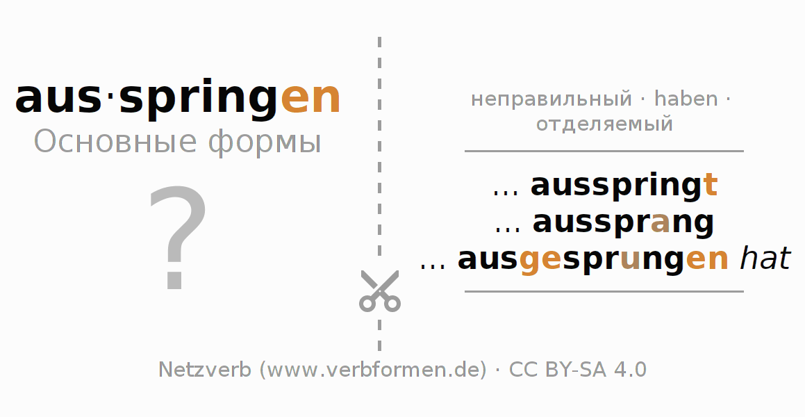 С обучающими карточками можно по отдельности изучать и тренировать спряжения немецких глаголов. Для этого на учебных листах, формы глагола ausspringen стоит обрабатывать по порядку. Необходимые формы глагола должны быть представлены в голове. Затем они сверяются с подсказками на карточках. При правильном ответе подтверждается ваш прогресс в обучении. Если есть ошибки, можно использовать подсказки для запоминания неизвестных форм. Но лучше всего распечатать PDF фаил с обучающими карточками и сложить их как было указано. Таким образом их можно использовать в стопке с другими глаголами для обучения. Еще есть множество других рабочих листов с глаголами ausspringen. Все материалы доступны в виде Открытых образовательных ресурсов(ООР) в рамках лицензии CC BY-SA 4.0 бесплатны и могут быть свободно использованы.