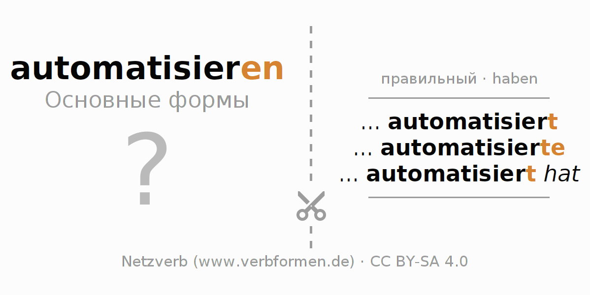 С обучающими карточками можно по отдельности изучать и тренировать спряжения немецких глаголов. Для этого на учебных листах, формы глагола automatisieren стоит обрабатывать по порядку. Необходимые формы глагола должны быть представлены в голове. Затем они сверяются с подсказками на карточках. При правильном ответе подтверждается ваш прогресс в обучении. Если есть ошибки, можно использовать подсказки для запоминания неизвестных форм. Но лучше всего распечатать PDF фаил с обучающими карточками и сложить их как было указано. Таким образом их можно использовать в стопке с другими глаголами для обучения. Еще есть множество других рабочих листов с глаголами automatisieren. Все материалы доступны в виде Открытых образовательных ресурсов(ООР) в рамках лицензии CC BY-SA 4.0 бесплатны и могут быть свободно использованы.