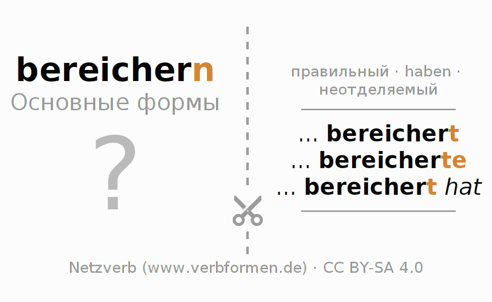 С обучающими карточками можно по отдельности изучать и тренировать спряжения немецких глаголов. Для этого на учебных листах, формы глагола bereichern стоит обрабатывать по порядку. Необходимые формы глагола должны быть представлены в голове. Затем они сверяются с подсказками на карточках. При правильном ответе подтверждается ваш прогресс в обучении. Если есть ошибки, можно использовать подсказки для запоминания неизвестных форм. Но лучше всего распечатать PDF фаил с обучающими карточками и сложить их как было указано. Таким образом их можно использовать в стопке с другими глаголами для обучения. Еще есть множество других рабочих листов с глаголами bereichern. Все материалы доступны в виде Открытых образовательных ресурсов(ООР) в рамках лицензии CC BY-SA 4.0 бесплатны и могут быть свободно использованы.