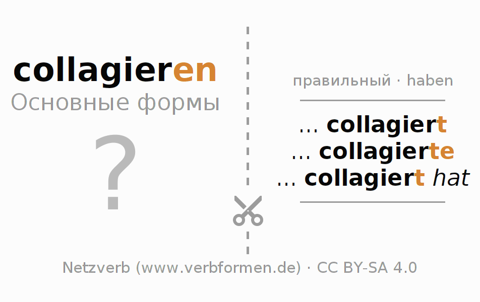 С обучающими карточками можно по отдельности изучать и тренировать спряжения немецких глаголов. Для этого на учебных листах, формы глагола collagieren стоит обрабатывать по порядку. Необходимые формы глагола должны быть представлены в голове. Затем они сверяются с подсказками на карточках. При правильном ответе подтверждается ваш прогресс в обучении. Если есть ошибки, можно использовать подсказки для запоминания неизвестных форм. Но лучше всего распечатать PDF фаил с обучающими карточками и сложить их как было указано. Таким образом их можно использовать в стопке с другими глаголами для обучения. Еще есть множество других рабочих листов с глаголами collagieren. Все материалы доступны в виде Открытых образовательных ресурсов(ООР) в рамках лицензии CC BY-SA 4.0 бесплатны и могут быть свободно использованы.