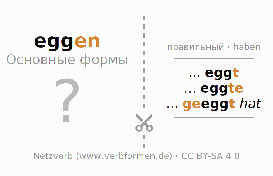 С обучающими карточками можно по отдельности изучать и тренировать спряжения немецких глаголов. Для этого на учебных листах, формы глагола eggen стоит обрабатывать по порядку. Необходимые формы глагола должны быть представлены в голове. Затем они сверяются с подсказками на карточках. При правильном ответе подтверждается ваш прогресс в обучении. Если есть ошибки, можно использовать подсказки для запоминания неизвестных форм. Но лучше всего распечатать PDF фаил с обучающими карточками и сложить их как было указано. Таким образом их можно использовать в стопке с другими глаголами для обучения. Еще есть множество других рабочих листов с глаголами eggen. Все материалы доступны в виде Открытых образовательных ресурсов(ООР) в рамках лицензии CC BY-SA 4.0 бесплатны и могут быть свободно использованы.