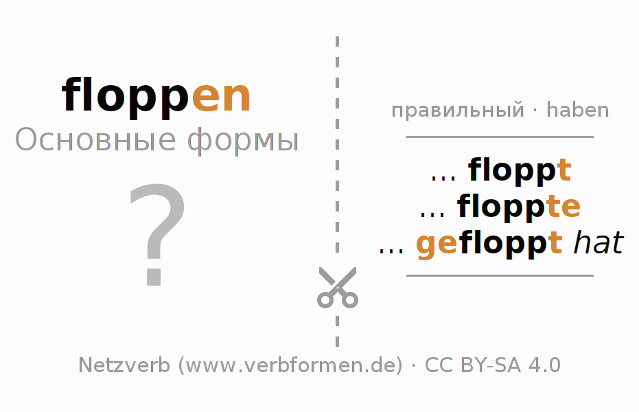 С обучающими карточками можно по отдельности изучать и тренировать спряжения немецких глаголов. Для этого на учебных листах, формы глагола floppen стоит обрабатывать по порядку. Необходимые формы глагола должны быть представлены в голове. Затем они сверяются с подсказками на карточках. При правильном ответе подтверждается ваш прогресс в обучении. Если есть ошибки, можно использовать подсказки для запоминания неизвестных форм. Но лучше всего распечатать PDF фаил с обучающими карточками и сложить их как было указано. Таким образом их можно использовать в стопке с другими глаголами для обучения. Еще есть множество других рабочих листов с глаголами floppen. Все материалы доступны в виде Открытых образовательных ресурсов(ООР) в рамках лицензии CC BY-SA 4.0 бесплатны и могут быть свободно использованы.