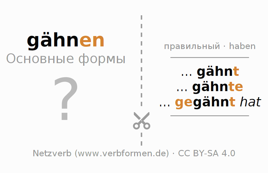 С обучающими карточками можно по отдельности изучать и тренировать спряжения немецких глаголов. Для этого на учебных листах, формы глагола gähnen стоит обрабатывать по порядку. Необходимые формы глагола должны быть представлены в голове. Затем они сверяются с подсказками на карточках. При правильном ответе подтверждается ваш прогресс в обучении. Если есть ошибки, можно использовать подсказки для запоминания неизвестных форм. Но лучше всего распечатать PDF фаил с обучающими карточками и сложить их как было указано. Таким образом их можно использовать в стопке с другими глаголами для обучения. Еще есть множество других рабочих листов с глаголами gähnen. Все материалы доступны в виде Открытых образовательных ресурсов(ООР) в рамках лицензии CC BY-SA 4.0 бесплатны и могут быть свободно использованы.