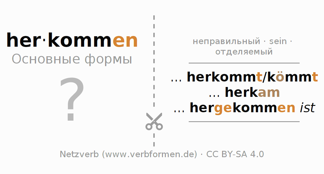 С обучающими карточками можно по отдельности изучать и тренировать спряжения немецких глаголов. Для этого на учебных листах, формы глагола herkommen стоит обрабатывать по порядку. Необходимые формы глагола должны быть представлены в голове. Затем они сверяются с подсказками на карточках. При правильном ответе подтверждается ваш прогресс в обучении. Если есть ошибки, можно использовать подсказки для запоминания неизвестных форм. Но лучше всего распечатать PDF фаил с обучающими карточками и сложить их как было указано. Таким образом их можно использовать в стопке с другими глаголами для обучения. Еще есть множество других рабочих листов с глаголами herkommen. Все материалы доступны в виде Открытых образовательных ресурсов(ООР) в рамках лицензии CC BY-SA 4.0 бесплатны и могут быть свободно использованы.