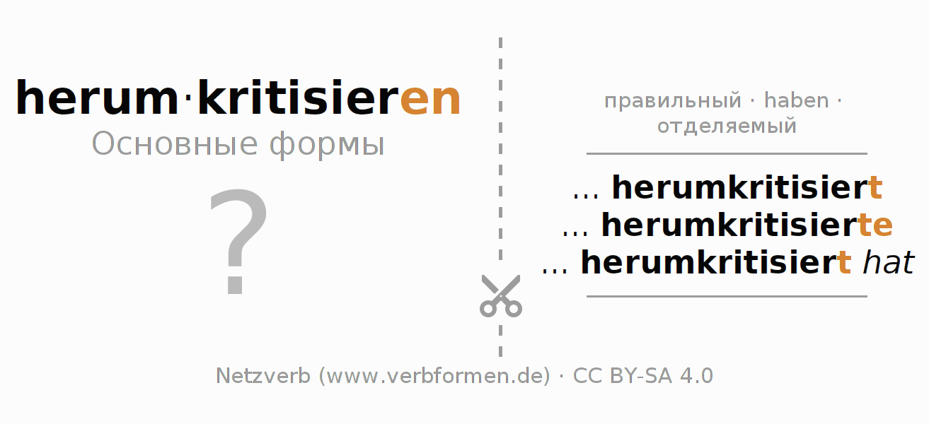 С обучающими карточками можно по отдельности изучать и тренировать спряжения немецких глаголов. Для этого на учебных листах, формы глагола herumkritisieren стоит обрабатывать по порядку. Необходимые формы глагола должны быть представлены в голове. Затем они сверяются с подсказками на карточках. При правильном ответе подтверждается ваш прогресс в обучении. Если есть ошибки, можно использовать подсказки для запоминания неизвестных форм. Но лучше всего распечатать PDF фаил с обучающими карточками и сложить их как было указано. Таким образом их можно использовать в стопке с другими глаголами для обучения. Еще есть множество других рабочих листов с глаголами herumkritisieren. Все материалы доступны в виде Открытых образовательных ресурсов(ООР) в рамках лицензии CC BY-SA 4.0 бесплатны и могут быть свободно использованы.