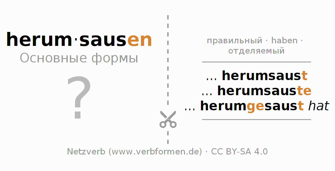 С обучающими карточками можно по отдельности изучать и тренировать спряжения немецких глаголов. Для этого на учебных листах, формы глагола herumsausen стоит обрабатывать по порядку. Необходимые формы глагола должны быть представлены в голове. Затем они сверяются с подсказками на карточках. При правильном ответе подтверждается ваш прогресс в обучении. Если есть ошибки, можно использовать подсказки для запоминания неизвестных форм. Но лучше всего распечатать PDF фаил с обучающими карточками и сложить их как было указано. Таким образом их можно использовать в стопке с другими глаголами для обучения. Еще есть множество других рабочих листов с глаголами herumsausen. Все материалы доступны в виде Открытых образовательных ресурсов(ООР) в рамках лицензии CC BY-SA 4.0 бесплатны и могут быть свободно использованы.
