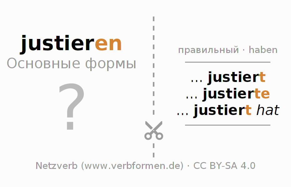 С обучающими карточками можно по отдельности изучать и тренировать спряжения немецких глаголов. Для этого на учебных листах, формы глагола justieren стоит обрабатывать по порядку. Необходимые формы глагола должны быть представлены в голове. Затем они сверяются с подсказками на карточках. При правильном ответе подтверждается ваш прогресс в обучении. Если есть ошибки, можно использовать подсказки для запоминания неизвестных форм. Но лучше всего распечатать PDF фаил с обучающими карточками и сложить их как было указано. Таким образом их можно использовать в стопке с другими глаголами для обучения. Еще есть множество других рабочих листов с глаголами justieren. Все материалы доступны в виде Открытых образовательных ресурсов(ООР) в рамках лицензии CC BY-SA 4.0 бесплатны и могут быть свободно использованы.