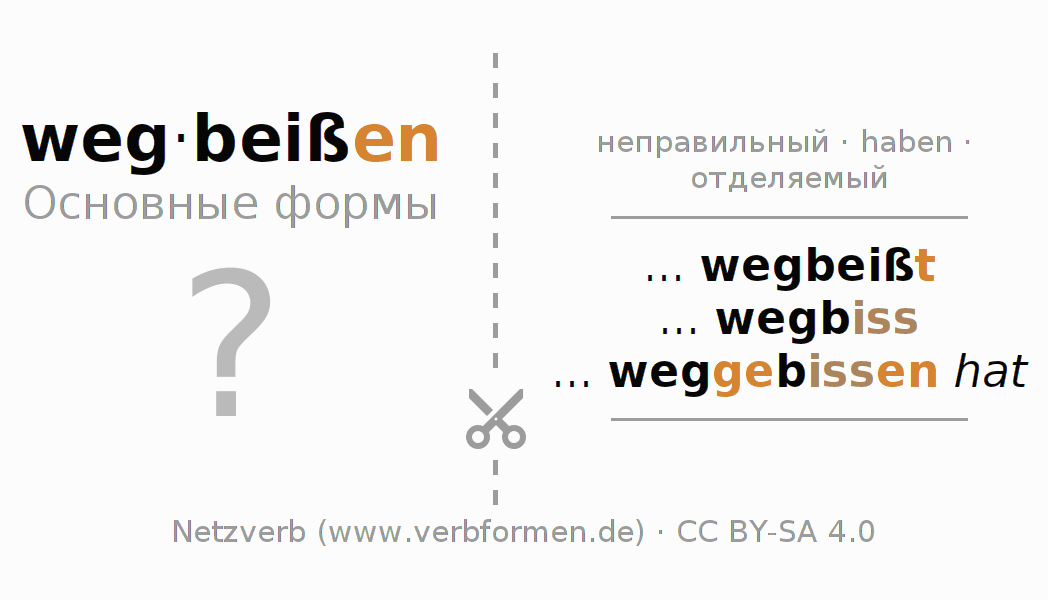 С обучающими карточками можно по отдельности изучать и тренировать спряжения немецких глаголов. Для этого на учебных листах, формы глагола wegbeißen стоит обрабатывать по порядку. Необходимые формы глагола должны быть представлены в голове. Затем они сверяются с подсказками на карточках. При правильном ответе подтверждается ваш прогресс в обучении. Если есть ошибки, можно использовать подсказки для запоминания неизвестных форм. Но лучше всего распечатать PDF фаил с обучающими карточками и сложить их как было указано. Таким образом их можно использовать в стопке с другими глаголами для обучения. Еще есть множество других рабочих листов с глаголами wegbeißen. Все материалы доступны в виде Открытых образовательных ресурсов(ООР) в рамках лицензии CC BY-SA 4.0 бесплатны и могут быть свободно использованы.