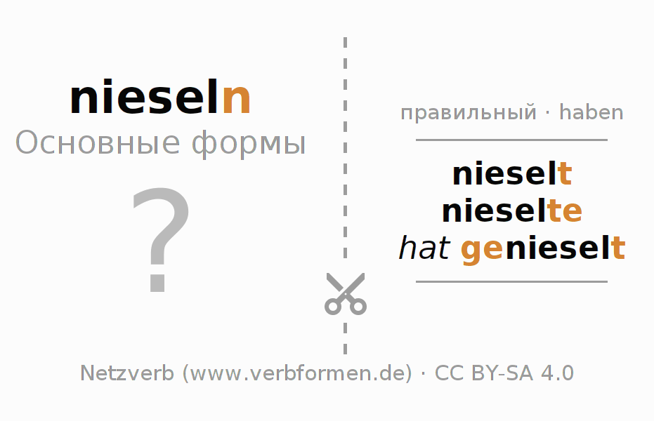 С обучающими карточками можно по отдельности изучать и тренировать спряжения немецких глаголов. Для этого на учебных листах, формы глагола nieseln стоит обрабатывать по порядку. Необходимые формы глагола должны быть представлены в голове. Затем они сверяются с подсказками на карточках. При правильном ответе подтверждается ваш прогресс в обучении. Если есть ошибки, можно использовать подсказки для запоминания неизвестных форм. Но лучше всего распечатать PDF фаил с обучающими карточками и сложить их как было указано. Таким образом их можно использовать в стопке с другими глаголами для обучения. Еще есть множество других рабочих листов с глаголами nieseln. Все материалы доступны в виде Открытых образовательных ресурсов(ООР) в рамках лицензии CC BY-SA 4.0 бесплатны и могут быть свободно использованы.