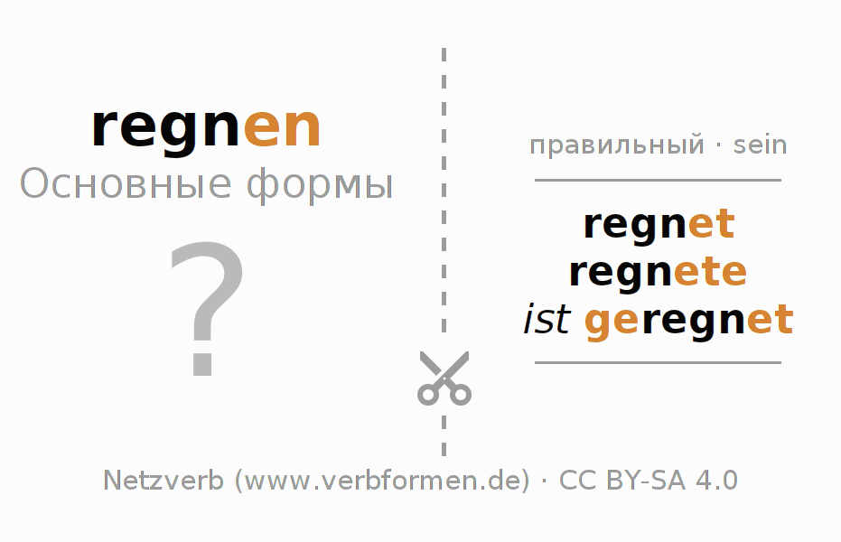 С обучающими карточками можно по отдельности изучать и тренировать спряжения немецких глаголов. Для этого на учебных листах, формы глагола regnen стоит обрабатывать по порядку. Необходимые формы глагола должны быть представлены в голове. Затем они сверяются с подсказками на карточках. При правильном ответе подтверждается ваш прогресс в обучении. Если есть ошибки, можно использовать подсказки для запоминания неизвестных форм. Но лучше всего распечатать PDF фаил с обучающими карточками и сложить их как было указано. Таким образом их можно использовать в стопке с другими глаголами для обучения. Еще есть множество других рабочих листов с глаголами regnen. Все материалы доступны в виде Открытых образовательных ресурсов(ООР) в рамках лицензии CC BY-SA 4.0 бесплатны и могут быть свободно использованы.